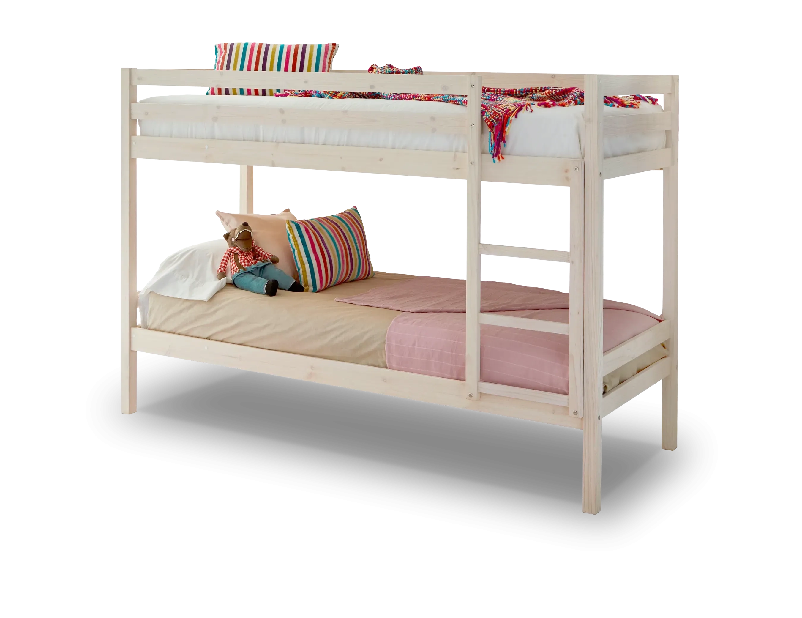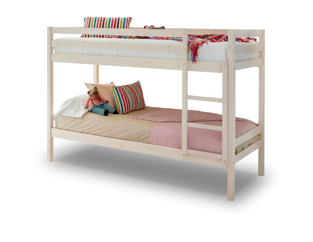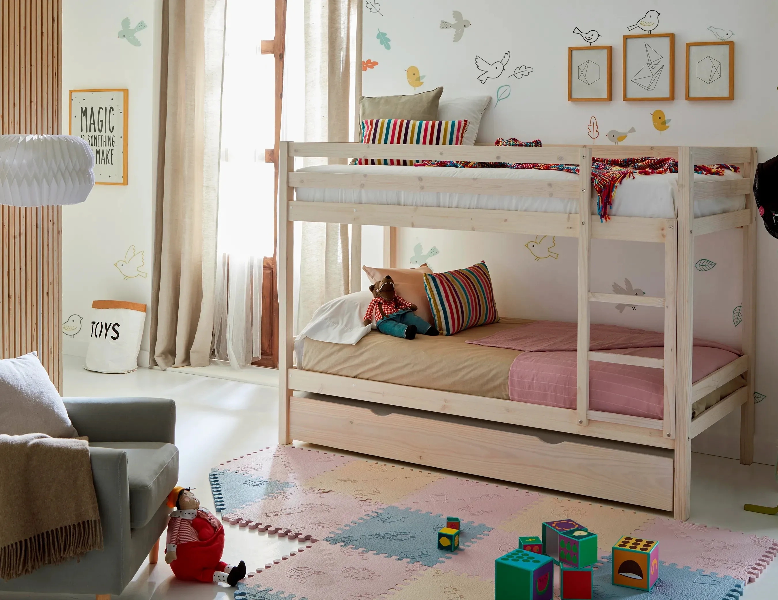 La Litera Premier es una opción robusta para dormitorios compartidos, fabricada en madera de pino macizo con acabado rugoso. Compatible con colchones de 90x190 cm, incluye láminas de somier y una escalera apta para ambas manos. Es convertible en dos camas individuales y cumple con la normativa europea de seguridad. El espacio inferior permite colocar un arrastre de 80x180 o 90x180 cm, con una altura máxima de colchón de 18 cm.