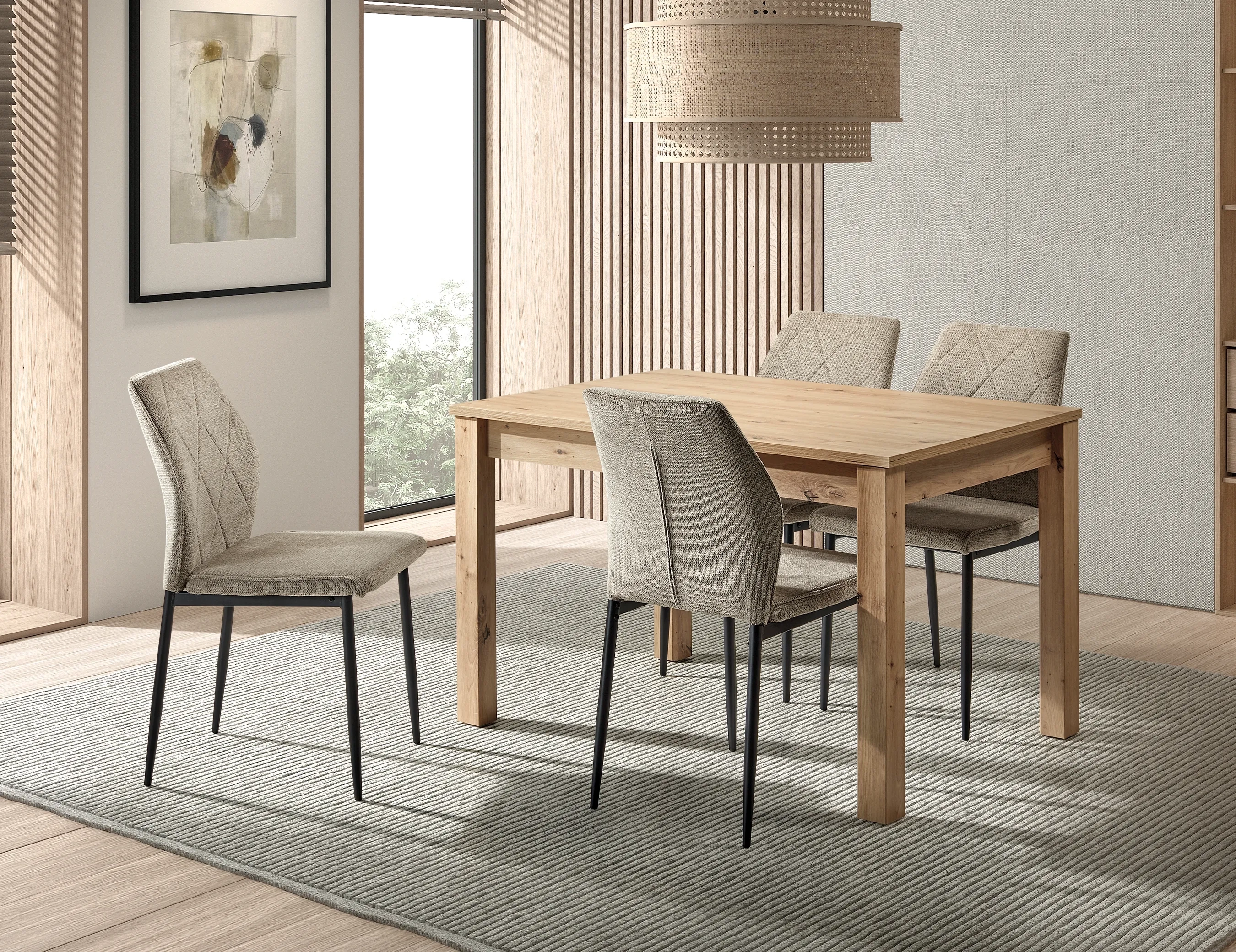La mesa R7 ofrece una solución práctica para comedores con espacio reducido. Fabricada en melamina texturada, cuenta con un sistema de apertura por deslizamiento lateral y extensión interior tipo libro, lo que permite adaptarla con rapidez a diferentes necesidades. Su diseño funcional encaja fácilmente en ambientes modernos y cotidianos.