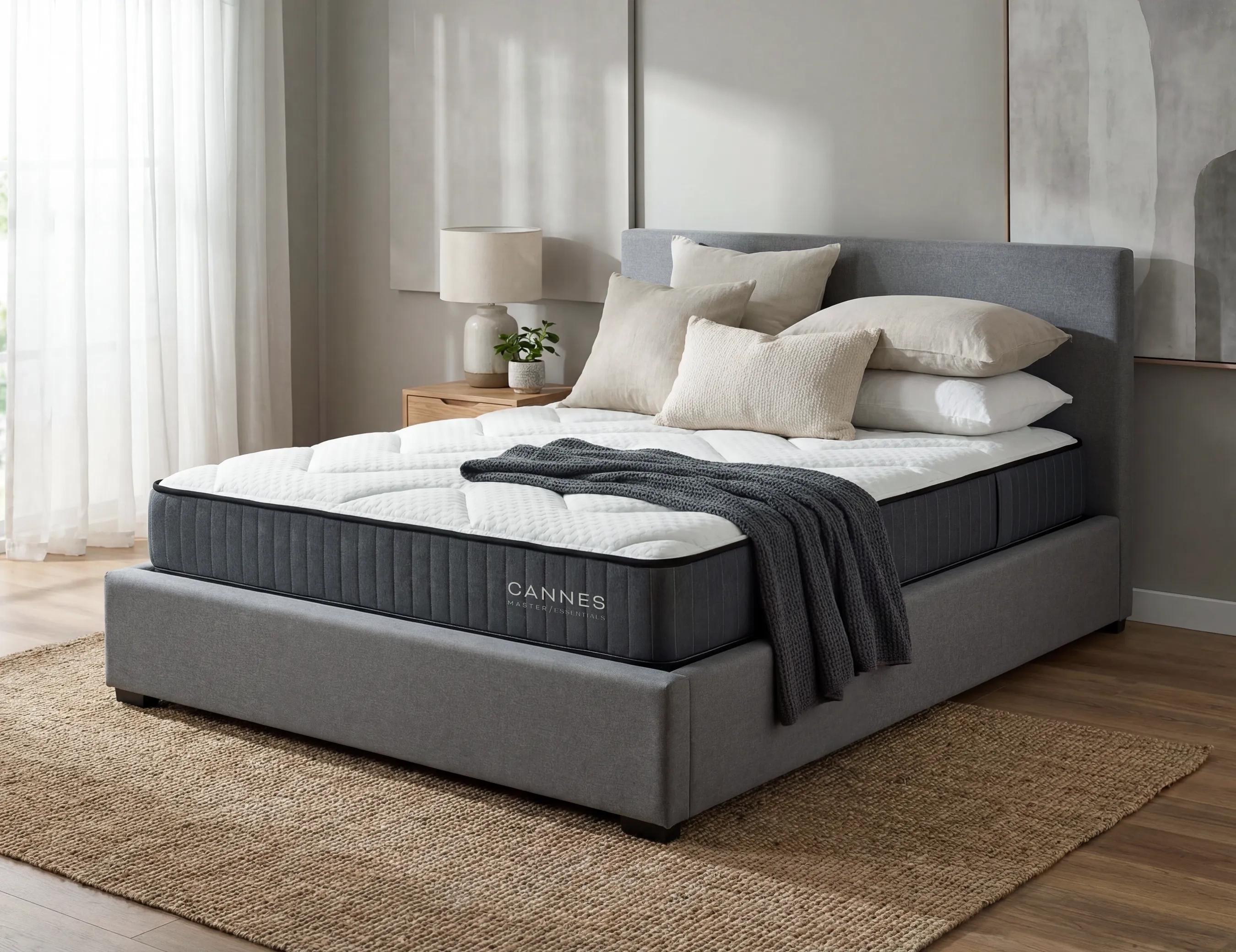 El colchón Cannes combina tecnología de muelles ensacados con acolchados confortables para ofrecer un descanso equilibrado. Su estructura central de muelles ensacados proporciona independencia de lechos, adaptándose a cada movimiento del cuerpo y mejorando la transpirabilidad interna del colchón.