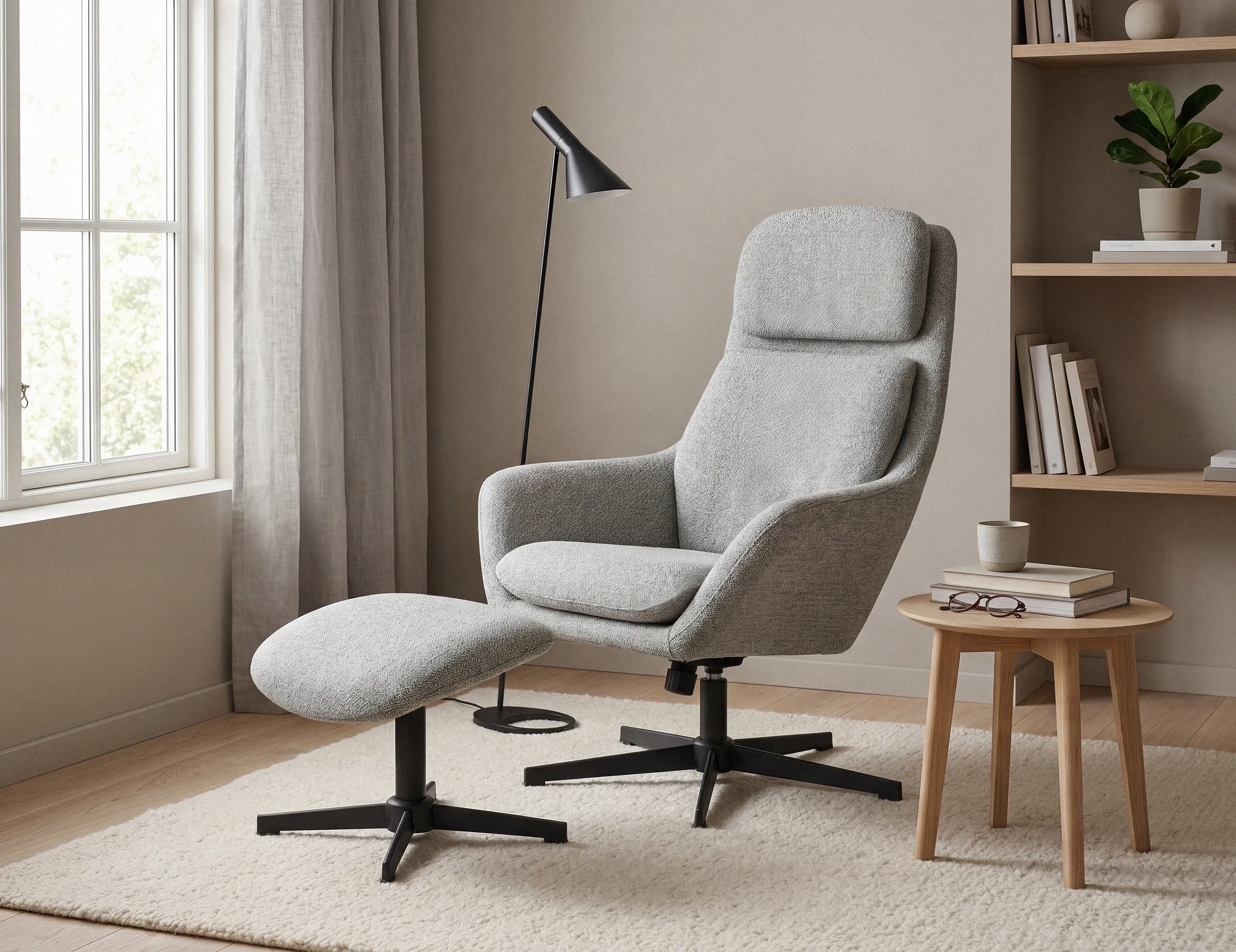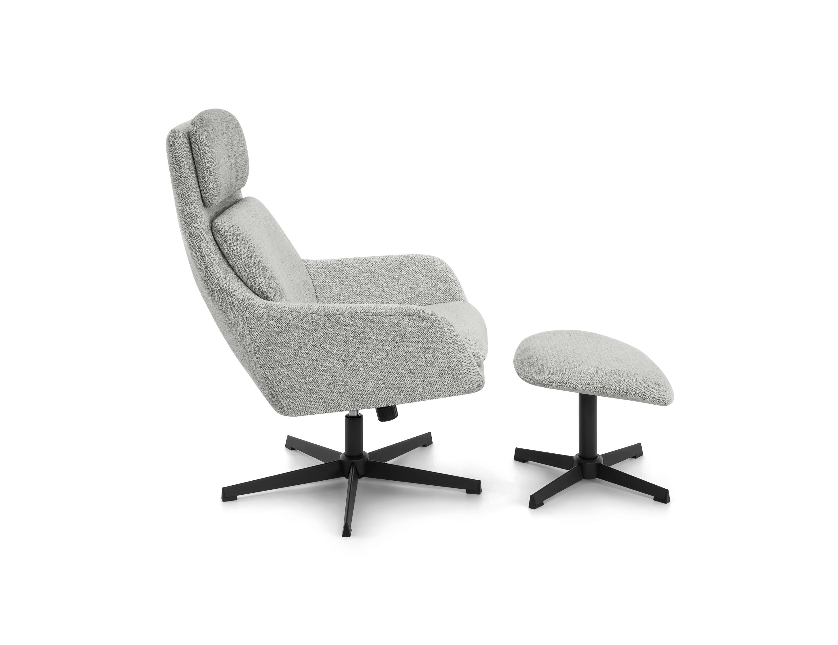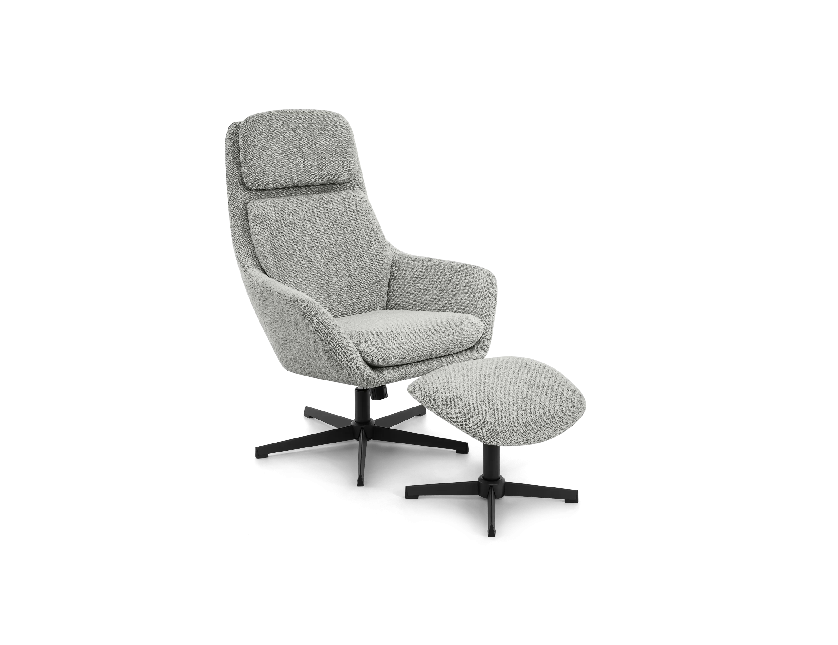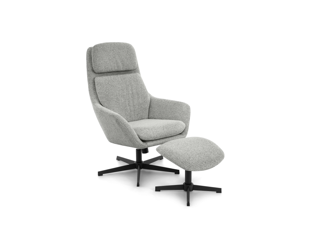 La butaca Capri destaca por su diseño moderno y minimalista, ideal para integrarse fácilmente en distintos espacios. Está fabricada con estructura de madera y contrachapado y tapizada en tela MILAN antimanchas. Incorpora asiento con HR de 25 kg que proporciona una sentada cómoda, junto con respaldo y cabezal rellenos de espuma HR para una acogida uniforme. Dispone de sistema giratorio 360º con función basculante, permitiendo mayor libertad de movimiento y confort en el uso diario. Soporta hasta 120 kg e incluye reposapiés a juego y base metálica en acabado negro mate que refuerza su estética contemporánea.