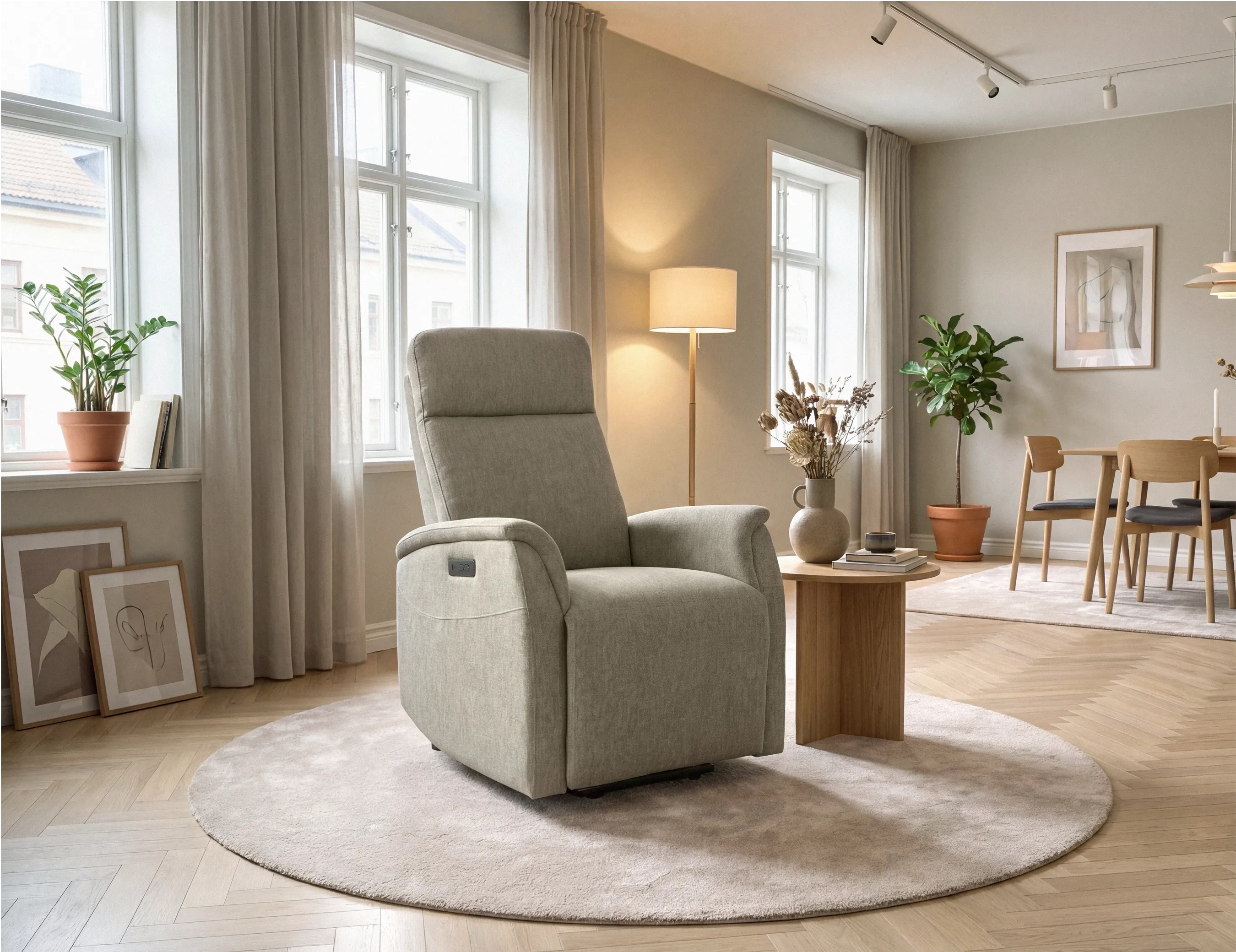 El sillón Indigo está fabricado con estructura de madera y contrachapado y tapizado en tela BREGO antimanchas. Incorpora asiento con HR de 28 kg combinada con muelles ensacados, aportando adaptabilidad y buena recuperación, junto con respaldo relleno de fibra siliconada para una acogida confortable. Dispone de sistema relax de 1 motor progresivo, que eleva primero el reposapiés y posteriormente reclina el respaldo de forma gradual. Integra además sistema Power-Lift de elevación asistida que facilita la incorporación. Soporta hasta 130 kg e incluye botonera con puertos USB y USB-C, además de conexión rápida trasera.