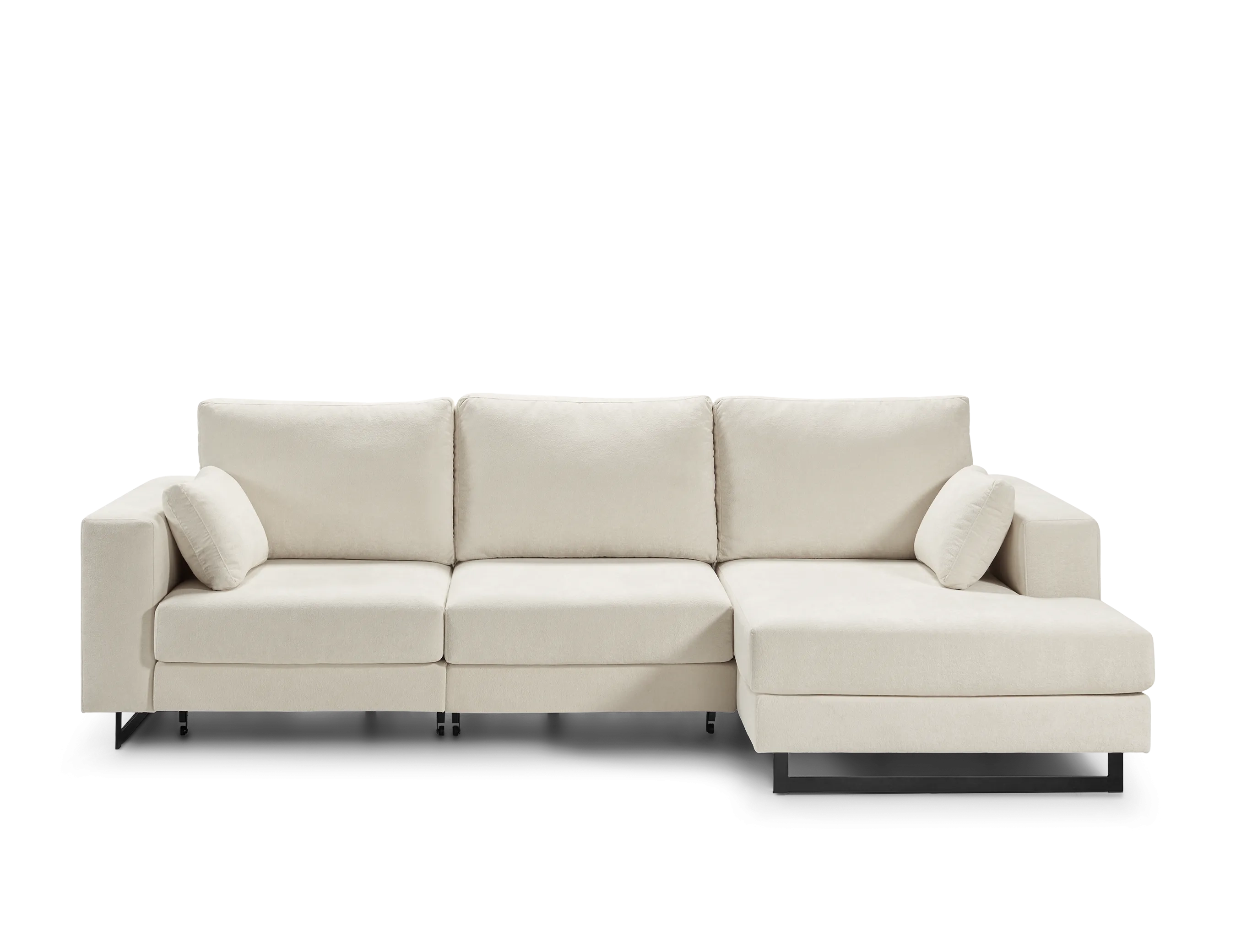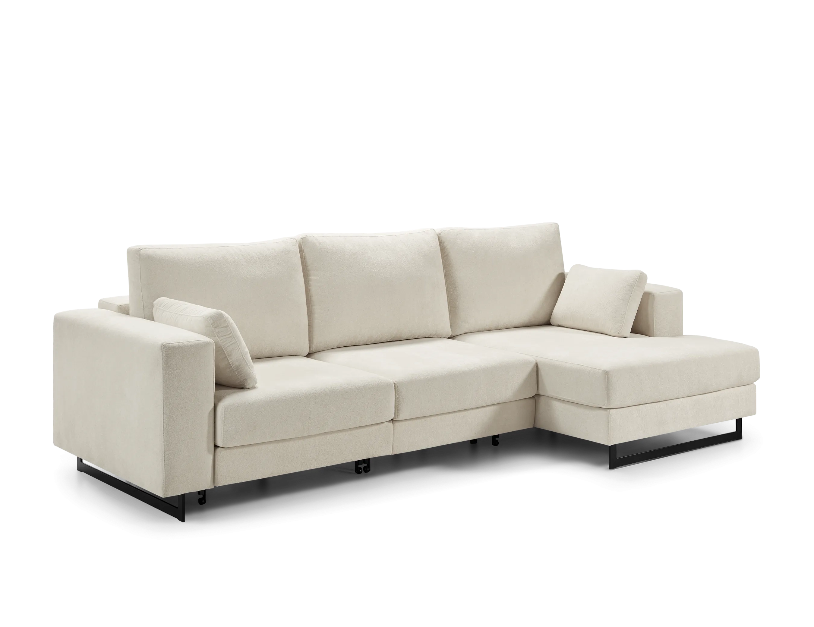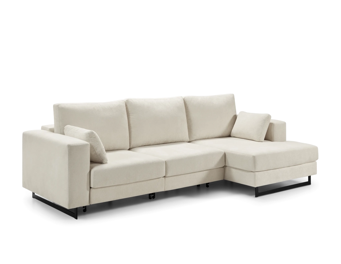 Cuenta con asientos deslizantes con carro al suelo que permiten ampliar la superficie de uso, y todo el conjunto es desenfundable. Incluye patas metálicas negras de diseño y patas interiores de refuerzo que aseguran estabilidad incluso en un uso intensivo. Se completa con 2 cojines decorativos a juego.