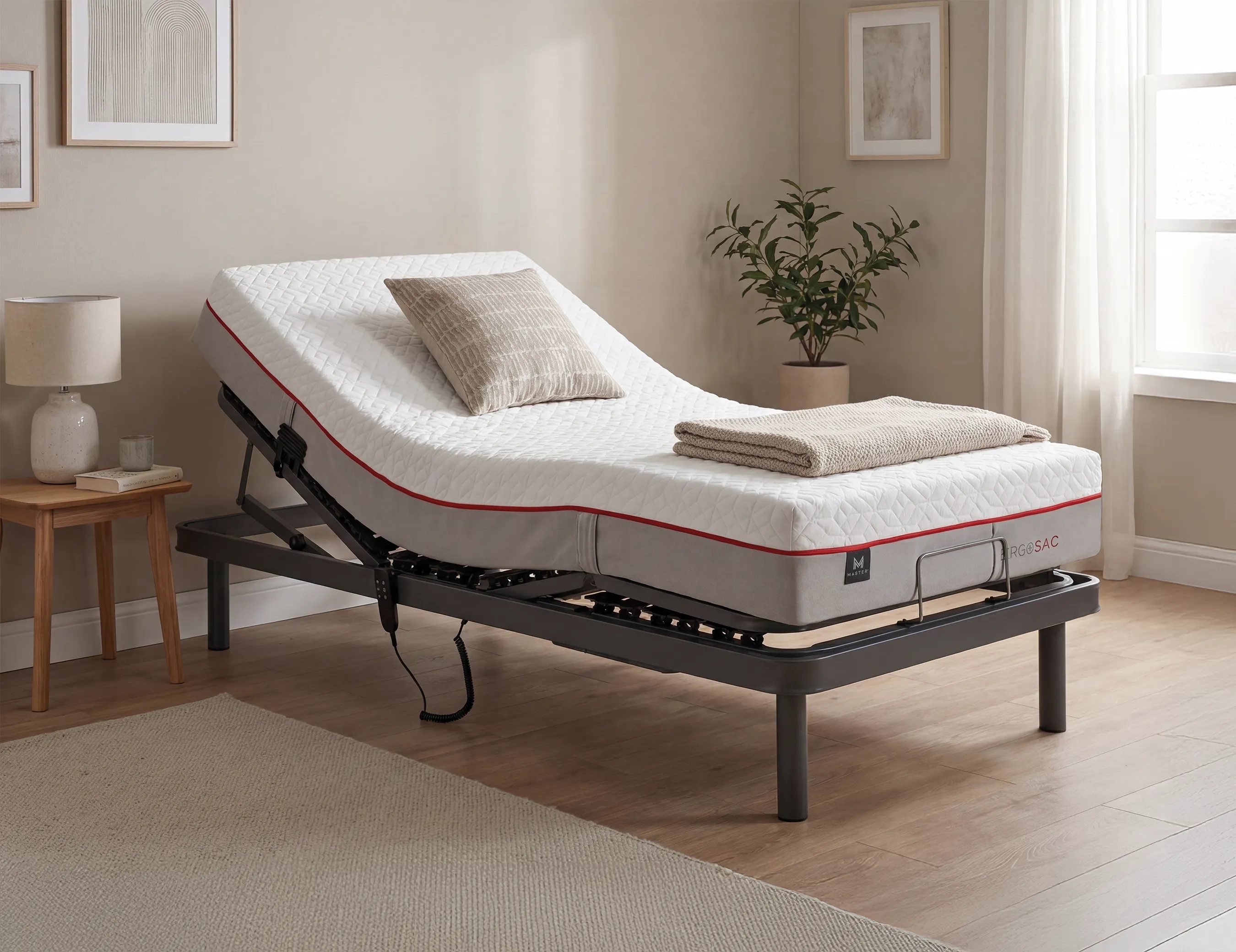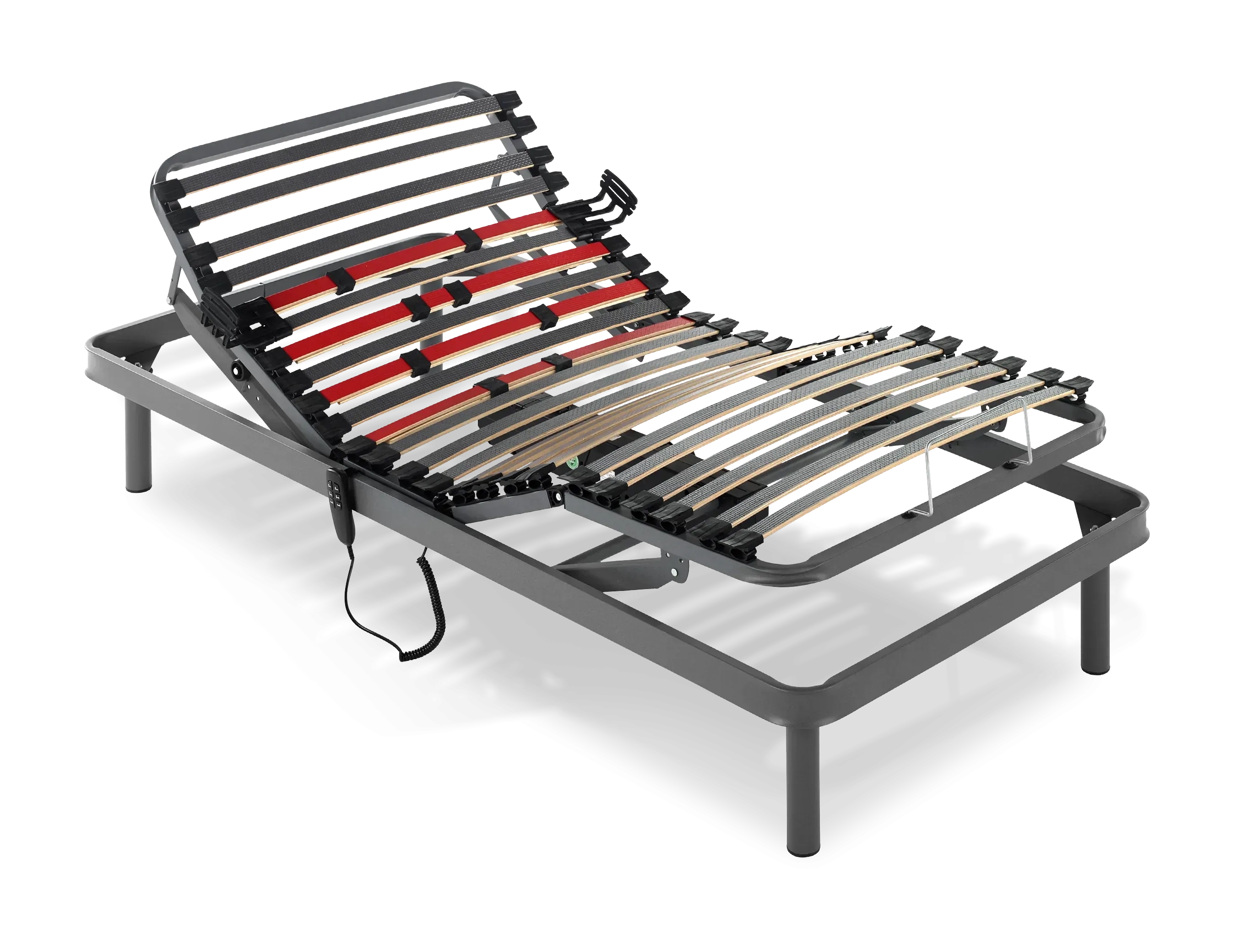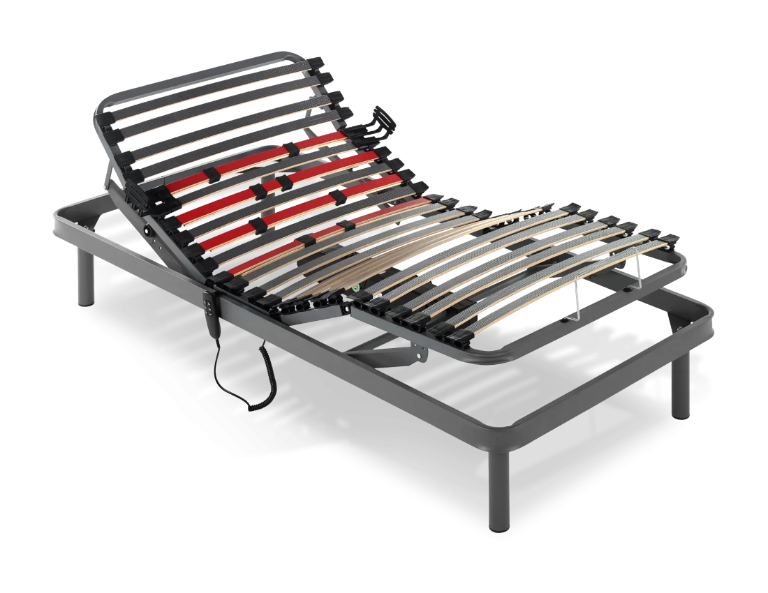 El somier articulado Valencia está fabricado con una estructura de tubo acerado de 60x20mm para mayor resistencia. Cuenta con multiláminas de madera de haya de 38mm, con doble lámina lumbar y reguladores, proporcionando una adaptabilidad óptima. Sus tacos de caucho Hytrel aseguran un soporte flexible y duradero. Este modelo incluye 5 planos de articulación y un motor eléctrico silencioso con función de vuelta a cero, controlado mediante un mando ergonómico por cable. Incluye patas métricas de 10mm.